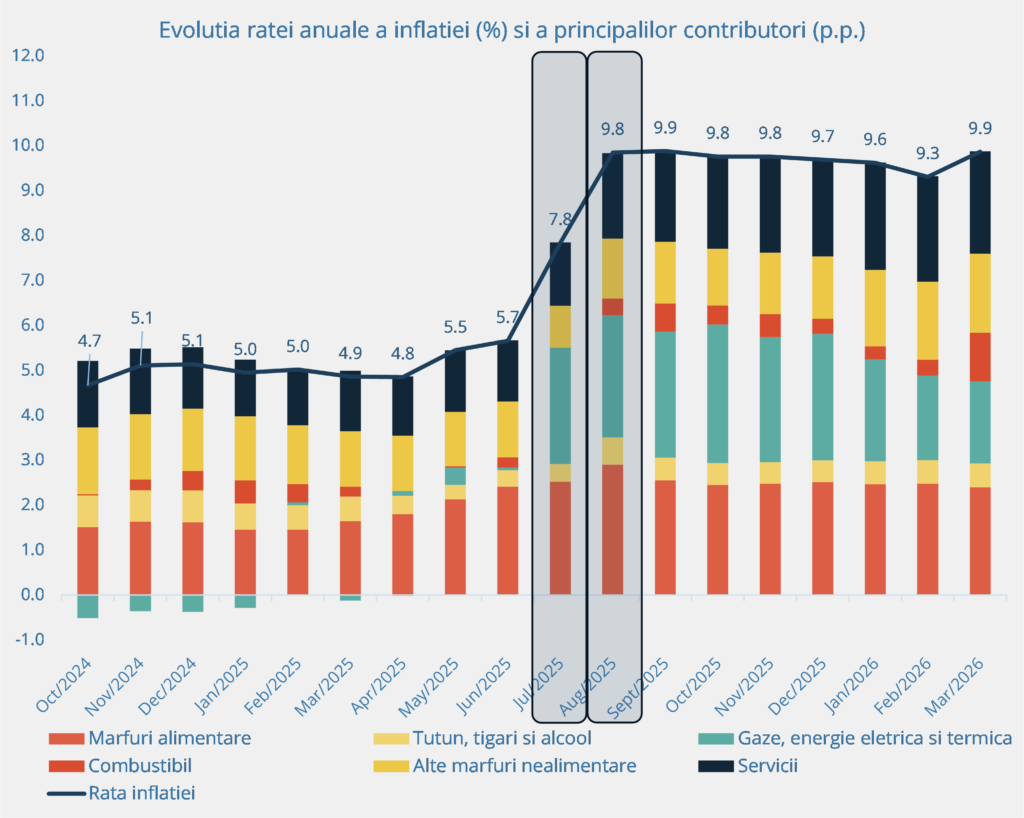 Datele recente confirmă o schimbare de dinamică în economia României. După mai multe luni de temperare, în martie, rata anuală a inflației a revenit pe creștere, ajungând la 9,87%, de la 9,31% în februarie, pe fondul scumpirii combustibililor și al contextului extern volatil.